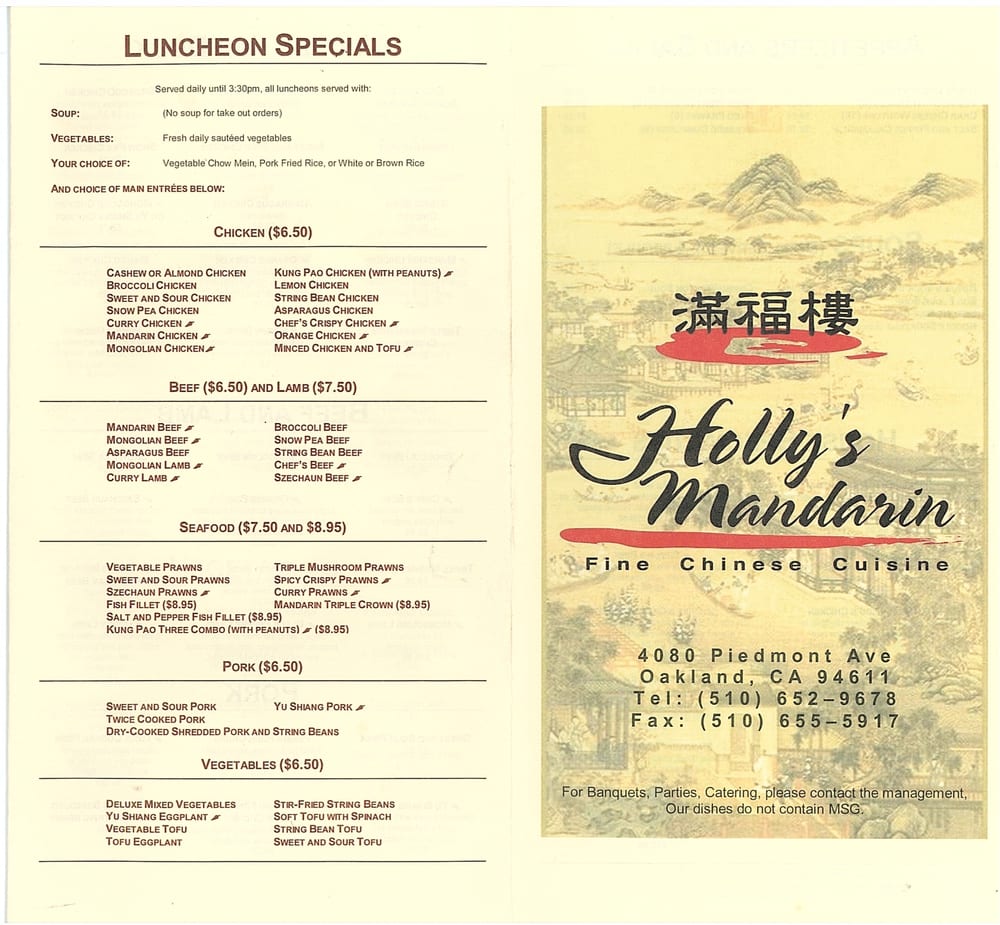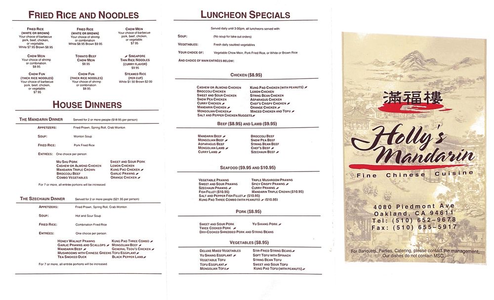 Holly's Mandarin, located in Oakland, CA, offers a wide range of traditional Chinese dishes with a personal touch. They take reservations, offer takeout, and cater to vegans and vegetarians with many options. The cozy atmosphere and attentive service make dining here a pleasant experience. Customers rave about the owner, Holly, who goes above and beyond to ensure guests have a memorable meal. The WarWonton soup, mandarin chicken, and green beans are highly recommended favorites. The restaurant's catering services are also praised for their flexibility and generous portions. While some dishes may be hit or miss, overall, Holly's Mandarin is a solid choice for Chinese cuisine in the East Bay area. The dedication to quality and customer satisfaction is evident in every aspect of the dining experience here.